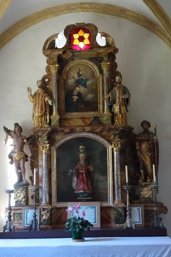 Als „Schreinwächter“ sind seitlich die Figuren der Pestpatronheiligen Sebastian mit den Pfeilen und Rochus mit der Pestbeule am Oberschenkel aufgestellt. Im Aufsatz des Altars sind die Figuren des heiliggesprochenen Ignatius von Loyola, dem wichtigsten Mitgründer und Gestalter des Jesuitenordens, und des heiligen Franz Xaver, einem Wegbereiter der christliche Mission in Asien, positioniert. In der Mitte des Aufsatzes befindet sich ein Gemälde des heiliggesprochenen Alfonso Maria de Liguori, dem Gründer des Redemptoristenordens. Dieser Orden war von 1820 bis 1854 auch in Frohnleiten tätig. Im gläsernen Schrank an der linken Wand ist die bekleidete Figur der heiligen Notburga von Rattenberg untergebracht. Die Tiroler Volksheilige wird als Patronin der Landwirtschaft verehrt. Ihre Statue wird bei den Fronleichnamsprozessionen von den örtlichen Kindern mitgetragen.