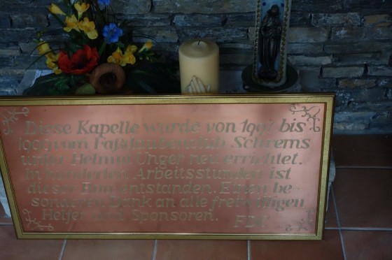 Der Fassdaubenclub Schrems, der 2013 sein 40-jähriges Bestandsjubiläum feierte, hatte sich unter dem damaligen Obmann Helmut Unger zur Aufgabe gemacht, diese abbruchreife Kapelle vor dem Verfall zu retten. Da eine Renovierung nicht mehr möglich war, wurde die Theresien-Kapelle am gleichen Standort neu errichtet. Für den Wiederaufbau wurde eine Spendenaktion mit einem Erinnerungsfoto als Andenken an die alte Kapelle ins Leben gerufen. Mit mehr als tausend Arbeitsstunden wurde der Neubau der gegenständlichen Kapelle vom F.D.C. Schrems bewerkstelligt und der wunderschöne alte Altar mit den erneuerten 14 Kreuzwegstationen rund um die im Zentrum befindliche Pieta (Darstellung der Maria mit dem Leichnam Christi auf dem Schoß) dorthin übernommen.