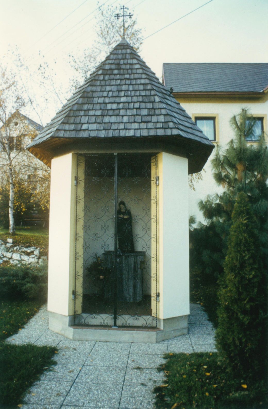 Beschreibung: Es ist eine achteckige Kapelle mit achteckigem Spitzdach mit Kreuz. Durch ein doppelflügeliges schmiedeeisernes Tor gelangt man in das Innere. Dort steht eine große, geschnitzte, alte Madonnafigur und es finden sich weitere fromme Gegenstände.