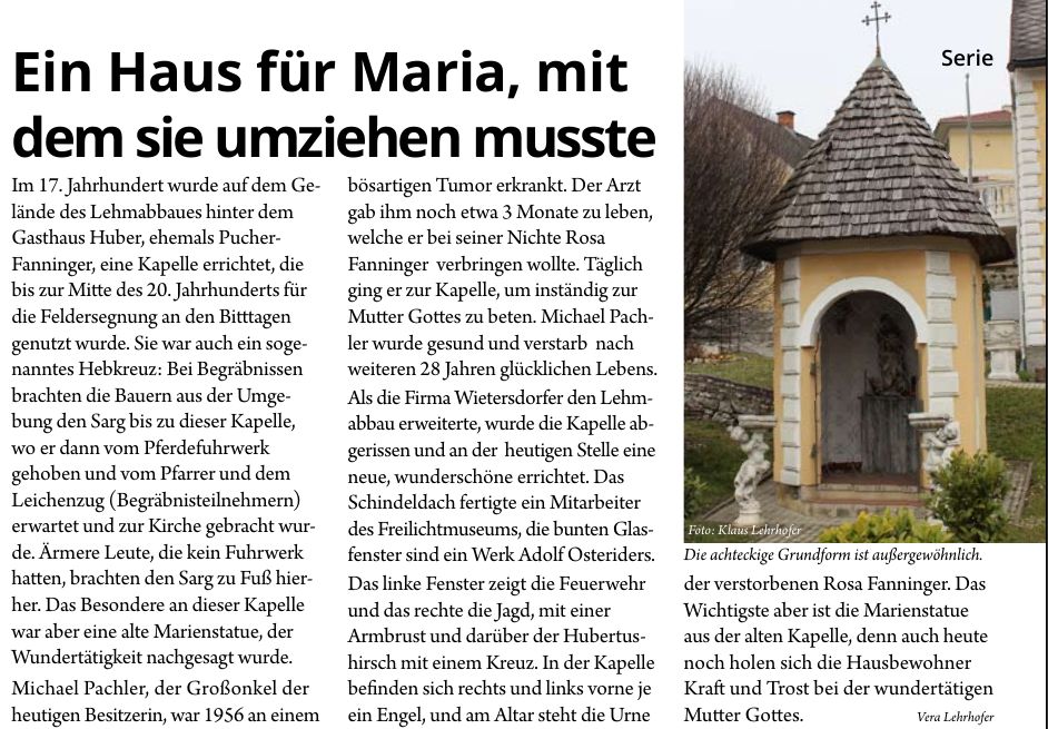 Die zweite Bedeutung war, dass diese “Bauernmadonna”, eine von einem Bauern geschnitzte Figur, hochverehrt war und als wundertätig angesehen wurde. Es gab einige Geschichten von Wundern, die auf sie zurückgeführt wurden (siehe Bilder – Pfarrblattauszug).