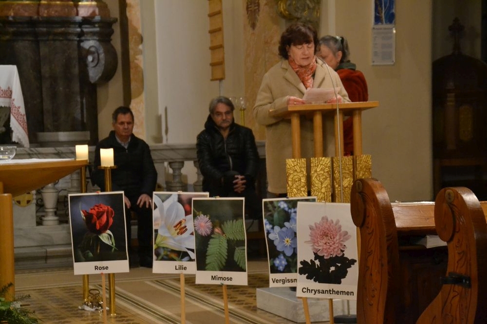 Im Zentrum der schön gestalteten Feier standen ein Taufgedächtnis mit Weihwasserritus, ein Evangelium (Mt, 6, 26-33), Blumentexte (in denen man sich mit der einen oder anderen Blumenbeschreibung ganz gut identifizieren konnte), Dankesworte sowie Fürbitten.