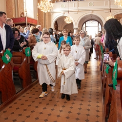 Die Erstkommunionkinder durften gemeinsam mit ihren Taufpaten/Taufpatinnen feierlich in die Kirche einziehen. Die Symbole der heiligen Taufe wurden vorgestellt und anschließend konnten die Patinnen/Paten und die Kinder ihr Taufversprechen sowie das Glaubensbekenntnis erneuern.
