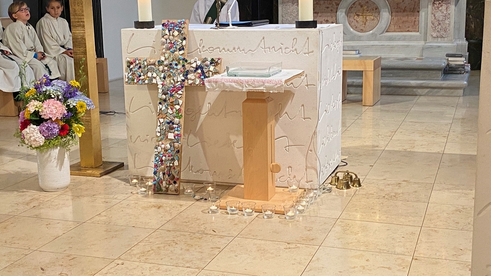Die Lichter vor dem bunten Kreuz künden von der Wort-Gottes-Feier, die Elisabeth Schöpf am 9. Juni, dem Vatertag, in unserer Kirche gestaltete.