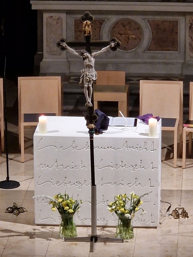 Zum Zeichen der Verehrung brachten die Gläubigen Narzissen zum enthüllten Kreuz. Das zarte Gelb der Blumen ist ein Hoffnungsschimmer. Erlösung ist in Sicht, bald bricht der Ostermorgen an!
